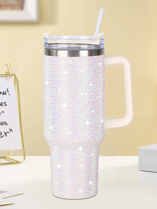 1pc 40oz Handle Car Sticker Diamond Decor Stainless Steel Vacuum Insulated Cup With Straw